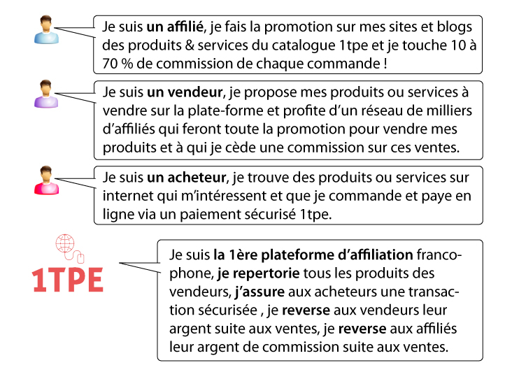Il vous suffit de trouver un produit dont vous désirez faire la promotion sur internet. De vous procurez le lien d'affiliation qui correspond à ce produit. De faire connaître ce lien aux prospects en en faisant la communication le plus largement possible. Et enfin de comptabiliser les commissions sur ventes que vous allez percevoir grâce aux achats de vos prospects.